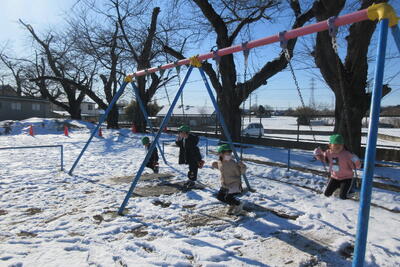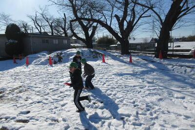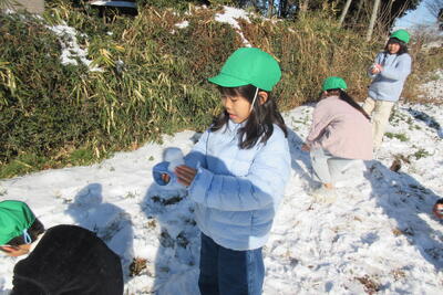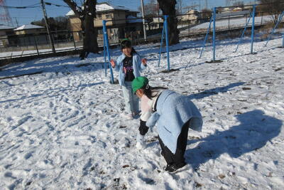 前日の日曜日に降った雪が校庭にまだ残っていました。子どもたちは大喜びで友達と雪遊びをしていました。