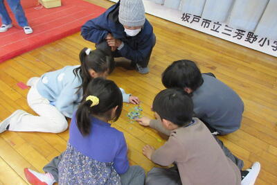 1年生が生活科で昔遊びの会を行いました。ボランティアのみなさんに教えてもらいながら、昔の遊びを楽しんでいました。