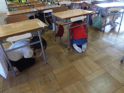 子供たちは、素早く机の下に身を隠し、自分の身を守ることができました。