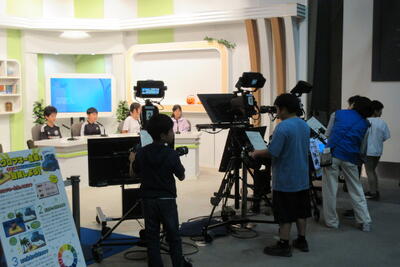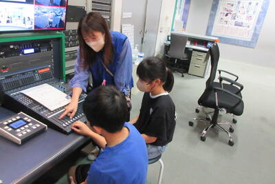 映像ミュージアムでは、それぞれの役割にわかれてニュース番組の撮影を体験しました。
