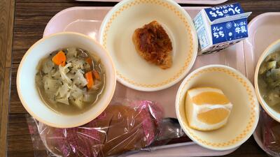くろぱん・野菜のスープ煮・ポークチーズかつ・ジューシーフルーツ・牛乳